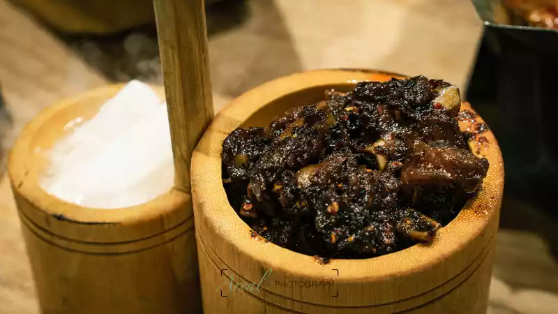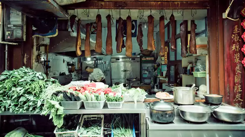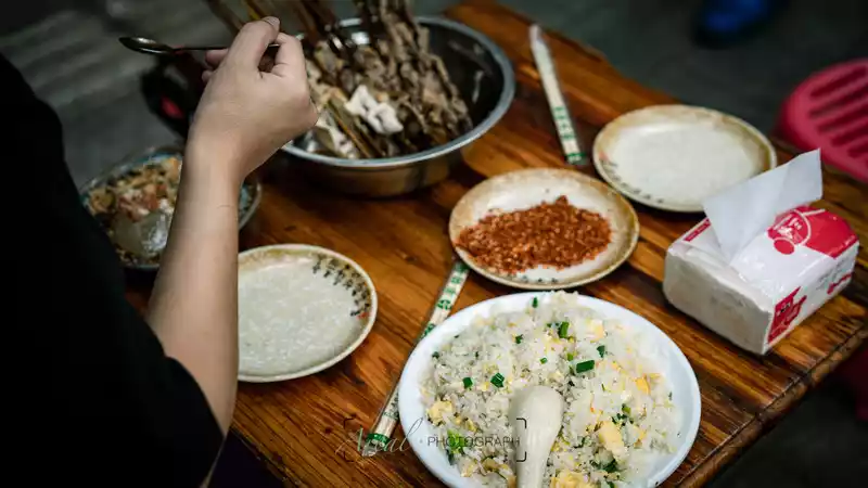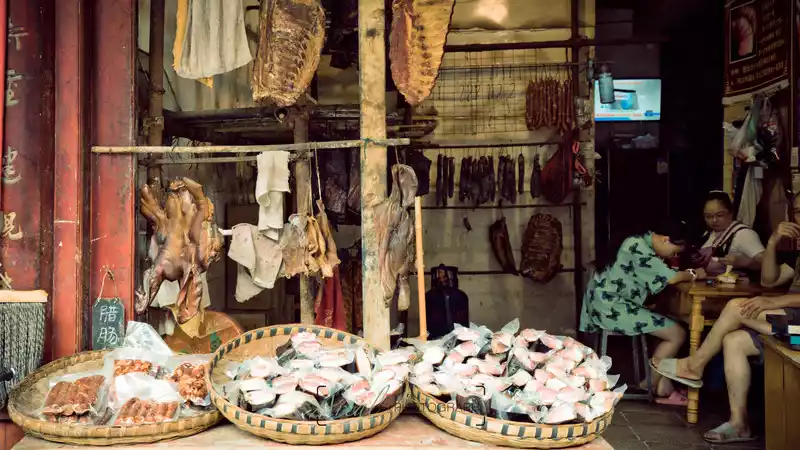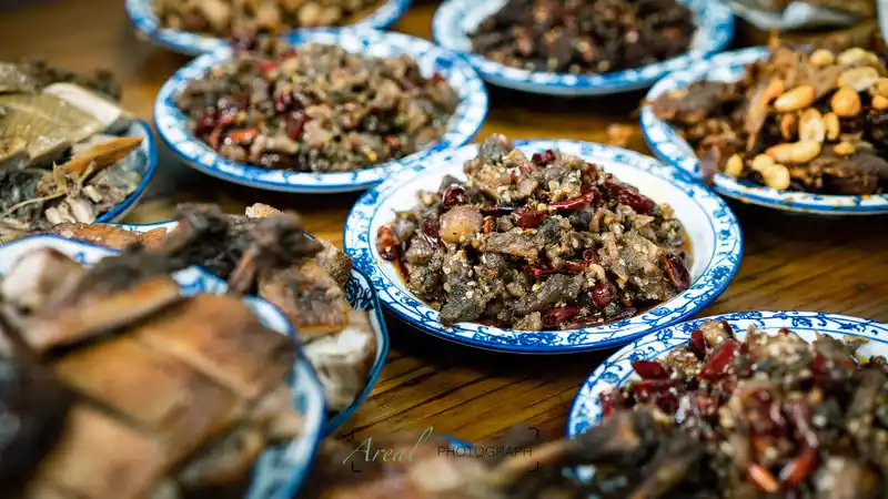 The folk customs of the town are quite simple, and both sides of the road are occupied by large and small restaurants, and consumption is not as intimidating as the ancient town with too much commercial flavor. Old bacon and sausages are hung in front of every restaurant, which is a specialty here.