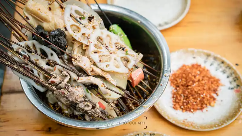 A semi-self-service roadside stall model, I can be regarded as an eyebrow. Holding the plate and placing it on the table, this position is considered to be claimed. Then take the skewers yourself and pour the juice yourself. The juice is divided into two types: red oil and rattan pepper, and you can take it yourself. When eating, first soak the skewers in the soup, and then dip them in a dry dish, and the superposition of several chili flavors creates an irresistible temptation. Bite by bite skewer and bite of ice powder, left and right, eat a lot of fun.