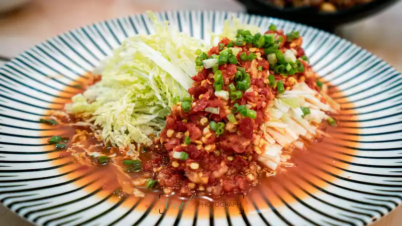 Hot and sour cabbage is especially good as an appetizer. The peculiar taste of cold potato slices is fascinating, so be sure to order it.