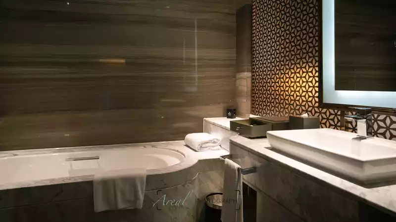 Marine elements spread from the lobby to the rooms. The ceiling of the room has a pointed ceiling with cut lines, and it feels like sleeping in a tent and looking up at the stars while lying on the bed in the dimly lit.