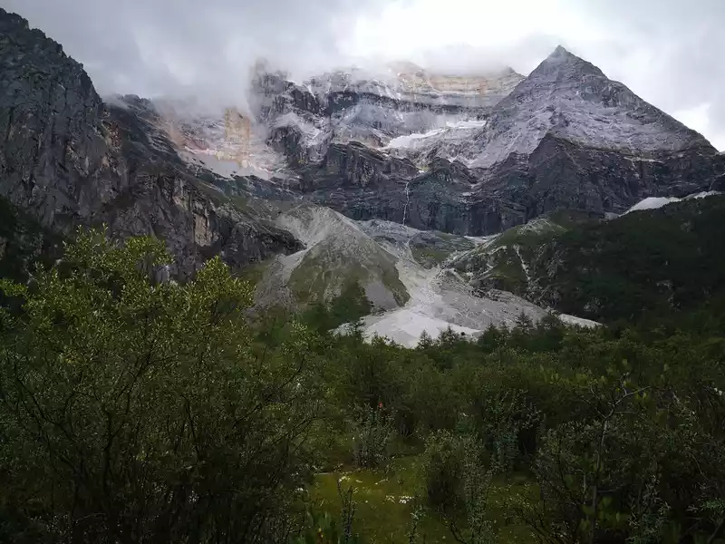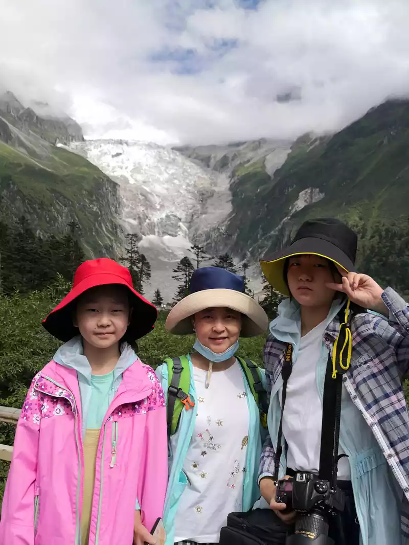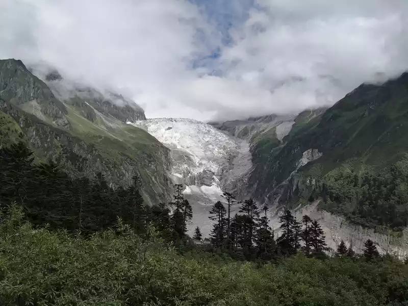 Hailuogou National Forest Park, located in Luding County, Ganzi Tibetan Autonomous Region, Sichuan Province, is 319 kilometers away from Chengdu and 49 kilometers away from Kangding, and is one of the only remaining low-altitude glaciers in the world. Hailuogou tourist attraction is located between the canyons. The terrain here is complex, the climate type is special, and the mountains are lush and lush. The climate is pleasant, with an average annual temperature of around 15 degrees Celsius. The summit is covered with snow all year round, with an average annual temperature of around -9 degrees Celsius. Hailuogou tourism resources have three characteristics: First, Hailuogou is located at the foot of the mountain, under the sun, looking at the Gongga Snow Mountain that is snowy all year round, magnificent, radiant and magnificent. Second, Hailuogou Glacier is the lowest glacier at the same latitude in China, with the lowest point being 2850 meters above sea level, and the glacier tongue extends 6 kilometers into the primeval forest, and the glacier and forest coexist. Hailuogou Glacier is a modern glacier formed 1600 years ago. There is a large icefall more than 1,000 meters wide in the ditch, falling 1,080 meters, which is unparalleled in the world. Third, in this icy and snowy glacier world, there are dozens of hot spring spots, and tourists can take hot spring baths on the glacier. We took a sightseeing bus ride for nearly an hour on the rugged mountain road to Camp No. 3, from low to high altitude, different vegetation and landscapes were presented in front of us, and finally took the cable car to Camp No. 4, where we saw the stunning No. 1 Glacier Icefall up close. It is like a galaxy pouring down from the blue sky. Unless you see it with your own eyes, there are no words that can describe its magnificence and greatness. Further up, there is Red Stone Beach, with cluttered stones spread on the hillside, and melted ice water flowing over the mountains, simple and pure. Coming down from Camp No. 4, we came to the glacier tongue at the foot of the mountain, which actually looked like two caves, and the locals told us that the gray thing at the entrance of the cave was not a stone, and if you look closely, it shows a light blue color, in fact, it is ice, at such a low altitude, it will not melt, it is really magical. At around four o'clock in the afternoon, we returned to Moxi Ancient Town and ended today's trip to Hailuogou. I had a local barbecue for dinner, and the most novel thing for me was that I grilled something called "Yanghe", which tasted okay, but I couldn't get used to it.