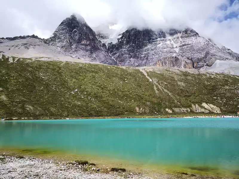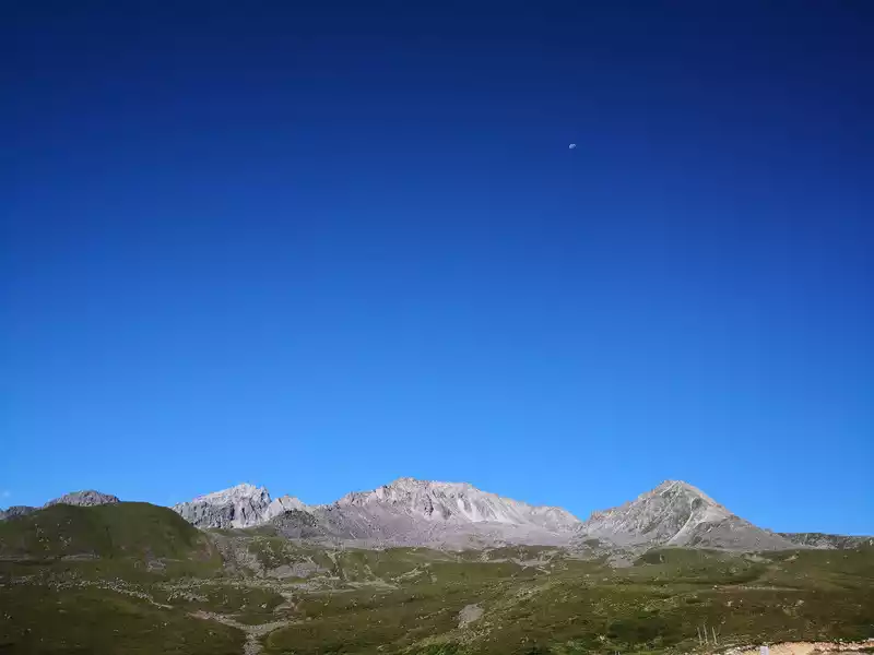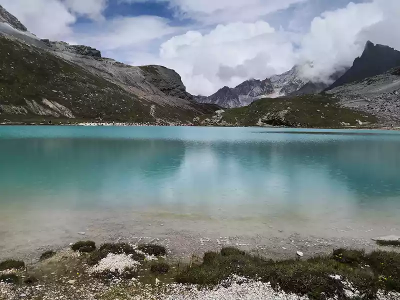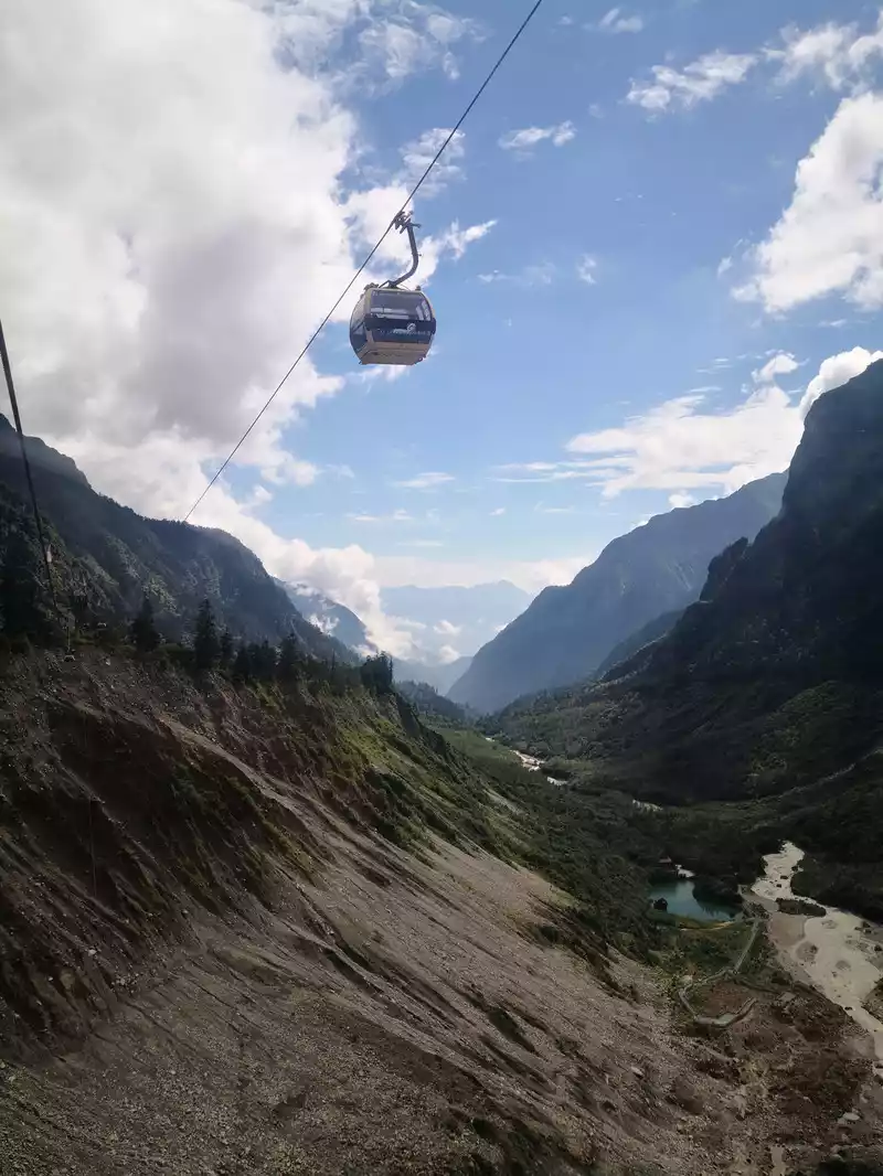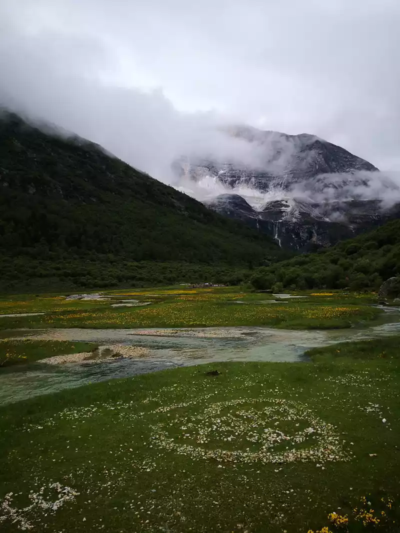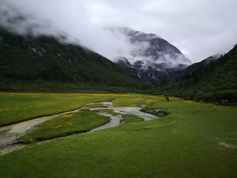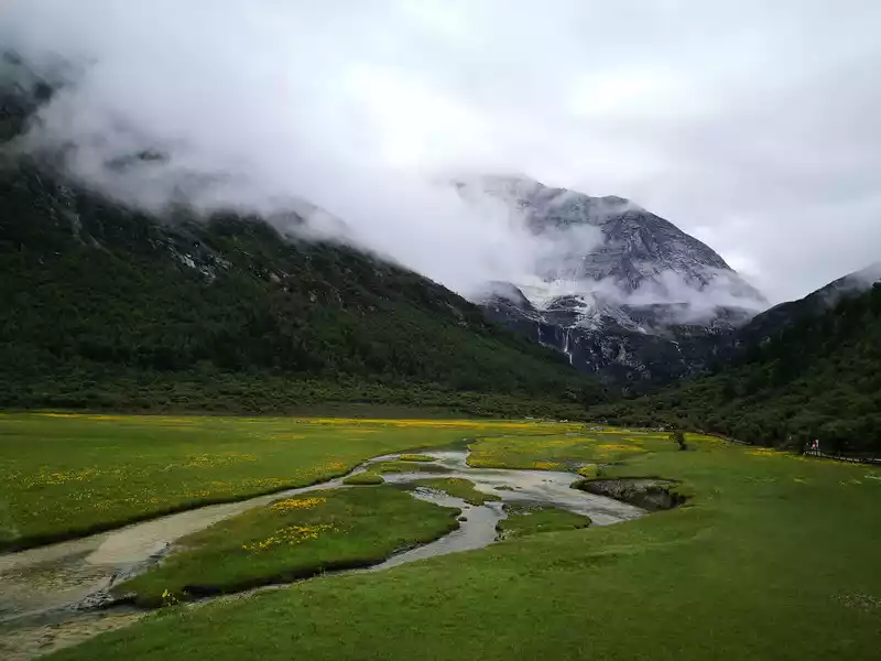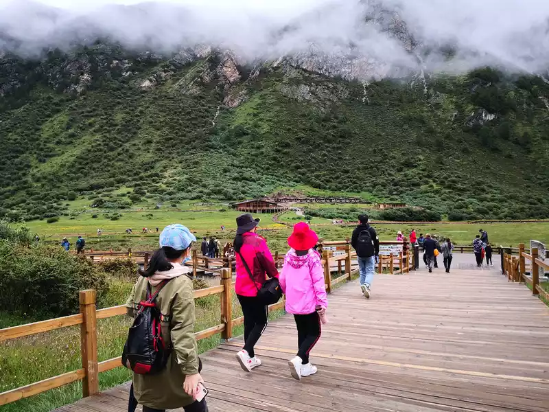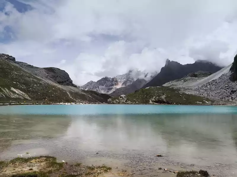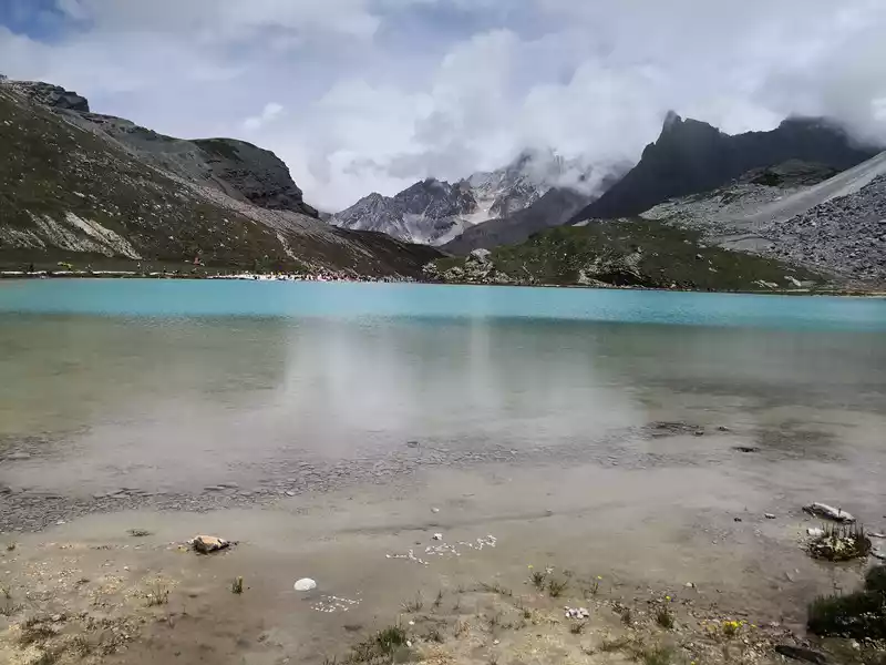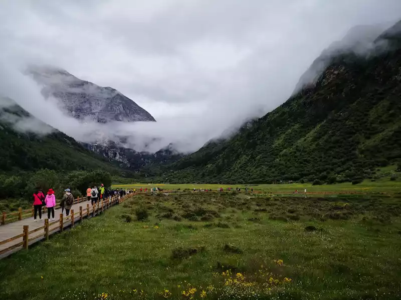 The long line is to take a battery car to Luorong Cattle Farm in Chonggu Meadow, and then start to hike 5 kilometers to the final point, which is also what we are looking forward to, the most beautiful milk sea and five-color sea. But today the weather is beautiful, and the sun shines on the snow-capped mountains. The beginning of the trip was still to take a sightseeing bus like yesterday, arrive at Zha Guanbeng, walk to Chonggu rest station to buy a ticket and take a battery car, and after a 20-minute drive to Luorong Cattle Farm. When I came to the Luorong Cattle Farm, it was 9:30 a.m., and when I looked up, I saw the Yangmai Yong Sacred Mountain in the Three Lords of the Sacred Mountain, which means "Manjushri Bodhisattva", representing wisdom. The large grassland below is dotted with small golden flowers, green, yellow and snow-capped mountains are mixed, and the beauty of the world is presented here. The further you go, the more the pace of climbing, the higher and higher the altitude, the steeper and steeper, the first section of about 2 kilometers can be ridden forward, but we still give up because we are afraid that the horseback riding will increase the height. Our family encouraged and supported each other to move forward, uncomfortable, stopped to take two breaths of oxygen, and looked at the beautiful and spectacular scenery along the way, so that we came all the way to the desperate slope, this slope was extremely steep, we had to take our time, finally climbed to the top of the slope, I thought victory was just around the corner, but when I looked up, there was a higher steep slope, the mood at that time could not be described in words, give up, not reconciled, continue, looking at the towering hillside, I was a little afraid. But life is like this, whether it is good or bad, you have to make a choice that you think is appropriate at the moment, so our family chooses to continue. There is a fork in the road on the Despair Slope, a flat road on the left leads to the Milk Sea, and a steep road on the right leads to the Sea of Five Colors. We choose to be bitter first and then sweet, and walk the five-colored sea. On the way to the top, the second sister suddenly shouted loudly, and I looked up and saw that two rock sheep were running fast on the opposite mountain. I was about to pick up my DSLR to take a picture of them, but they were long gone. After a short period of excitement, we reached the top of the mountain and saw a sea, but not a five-colored sea, we took a short break and walked forward, and the five-colored sea appeared in front of us. The five-color sea is also known as Deng Chongcuo, the relic sea also means auspicious sea, the five-color sea is named after the refraction of light, its real name is "Shan Zengcuo", it is located between Xiannai Ri and Yang Maiyong, at an altitude of 4,700 meters, the lake surface is round. The snow-capped mountains reflect the lake, presenting fantastic colors. While admiring her beauty, it rained lightly, and the raindrops fell on the water, like jumping elves, moving on the sacred lake, but the rain stopped after a while. Standing on the slope and looking down to the left, a milky blue, moon-like sea appeared in front of us, she was the sea of milk. Milk Sea, also known as Orongcuo, 4,500 meters above sea level, ancient glacial lake, shaped like water droplets, surrounded by snow-capped mountains, the lake water is clear and blue, and is famous for its exquisite and elegant water color emerald blue. The milk sea is in the shape of a scallop in the mountain hollow of Yangmaiyong, with blue snow water in the middle and a circle of milky white surrounded by this circle of milky white, which is roughly the origin of the name of the milk sea. The water near the shore is slightly black, and the bottom is the deposition of ancient plants, the light green area inside, and the deep blue water surface, which is translucent. The sea flows slightly, and the sunlight keeps passing over it through the clouds, so it also changes its brilliance like a jewel, sometimes gloomy, sometimes dazzling, sometimes erratic. The edge of the sea is filled with patches of meadows and broken leaves, soft, like a green flannel, carefully caring for this gem. The meadow is surrounded by hard stone walls and sand and gravel beaches, which are particularly cold. She is like a plateau pearl guarded by Yang Maiyong. We went down to get close and appreciated her beauty around the sea of milk. There is beauty from all angles, there is no superfluous language, only the sound of the SLR camera "clicking", which is a cheer for her beauty. At about three o'clock in the afternoon, we walked back, and the way down the mountain seemed easier and shorter. When we were about to arrive at the Luorong Cattle Farm, we once again saw the two rock sheep we saw on the five-colored seamount on the roadside slope, and now they were very well-behaved, allowing us to keep filming and watching. Going down to the cattle farm, Yang Maiyong's whole picture became clear, allowing us to admire her to the fullest. Today's itinerary can be described as "hell of the body, paradise of the eyes", go back to the hotel to have a good night's sleep, and maybe you can still dream of the rare beauty of this life!