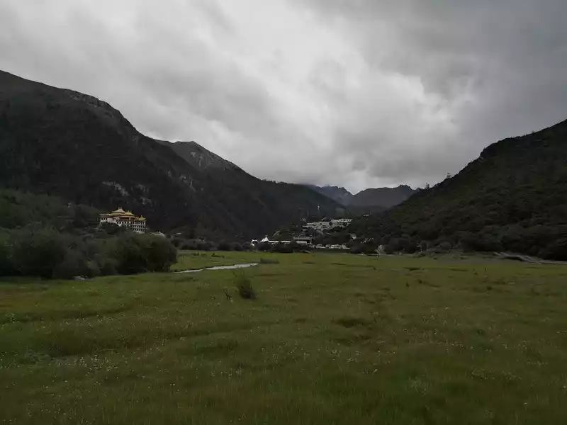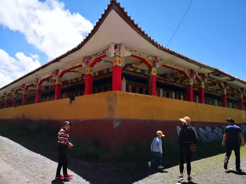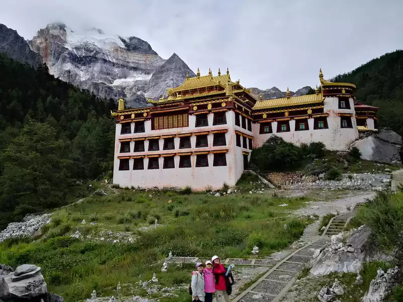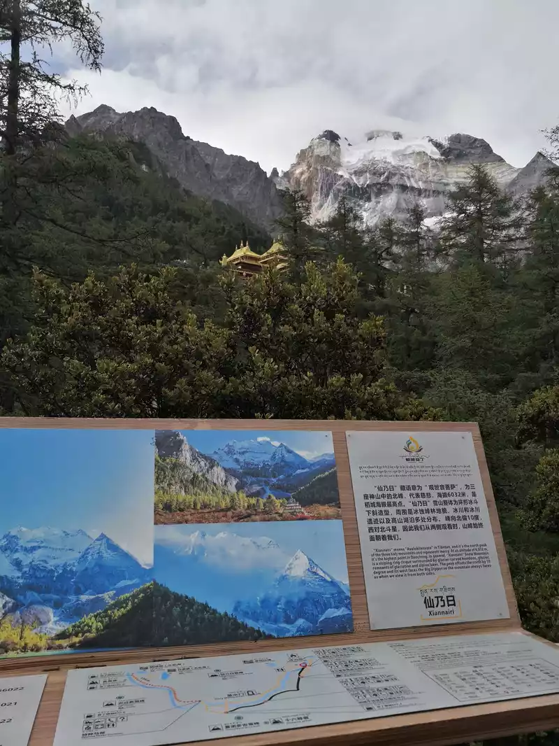 to take a sightseeing bus and get off at Zhaguan, pass through Chonggu Meadow and Chonggu Temple to the Pearl Sea to get close to Xiannai Day, one of the main sacred mountains of the Three Pillars. The entire short line is 3 kilometers round trip, which takes two or three hours. Because the time was not rushed, we set off for the visitor center at eight o'clock in the morning, and the weather was good today, and the sun came out. We bought tickets online, and we only need to scan our ID card to enter. After entering, I took a sightseeing bus for an hour, this hour is really a hell of the body, because the car is driving on a total of more than 200 180-degree curves, I have never felt some discomfort in people who have never received motion sickness, the car has been climbing up, after crossing a mountain, the three main sacred mountains of Xian Nai Ri and Charlotte Dorji are presented in front of our eyes, the top of the mountain is covered with snow, their tallness and majesty are full of praise, at this time enjoying the paradise of the eyes, throwing aside the discomfort. We passed through the smallest village of 8 households, called Yeerhong Village, and then drove flat through several mountains, gradually descending the mountain, and when we went down, we could see the Aden Village located halfway up the mountain, Aden Village is 34 kilometers away from Shangri-La Town, and the Aden Nature Reserve is named because it relies on the village, known as the "last Shangri-La". The small village is hidden between snow-capped mountains and forests, surrounded by undulating desolate mountains, and against the blue sky, the outline of the mountains is blue and black. At the end of the valley, the majestic Xian Nai Ri Snow Peak is bathed in the sun without reservation, concise and steep, like a few stick figures outlined. There are 28 households in the village, and the placement of each hidden house is very casual, but if you look closely, you will feel that they seem to have been carefully designed by the master and coordinated with nature. Around the Tibetan village, the flat highland barley also seems to be carefully arranged, all the way to the steep end of the hillside, faithfully decorating the beauty of Aden Village. Accommodation can also be in Aden Village, where you can see a different bright starry sky at night if the weather is good. The car went down the mountain, down to the mountain pass, and reached the end of the sightseeing bus to collapse, where people took out oxygen cylinders to take oxygen, afraid of high reactions, our family was fine, there was no reaction. Starting from Zha Guanbeng, we walked along the wooden plank road, with tall vegetation and gurgling snow-capped mountains and flowing water on both sides, and occasionally Buddhist murals on the large stones on both sides, with bright colors and vivid images. It may have taken more than ten minutes, we came to Chonggu Meadow, which is also a tourist rest stop, if you take a long line, you can take a battery car here, and take a short line and walk forward. As soon as you arrive at the ancient meadow, there is a large green grassland in front of you, and the Shenshan Charlotte Dorji stands on the opposite side, majestic and spectacular. Charlotte Dorjee means "Vajra Hand Bodhisattva", representing bravery and strength. On the right is the golden Chonggu Temple, Chonggu Temple occupies the best geographical location in the Aden Nature Reserve, standing in front of Chonggu Temple, with an almost exaggerated blue sky on top, green and yellow grass under your feet, in the distance is a thousand-year-old snow-capped mountain, and behind you is a canyon that has been sleeping for ten thousand years. Behind the ancient temple is the Xiannai Ri Sacred Mountain, which means "Guanyin Bodhisattva", representing kindness and kindness. This sacred mountain is like her representative, generous and majestic, capable of accommodating everything in the world. We headed towards Chonggu Temple, visited the temple for a while, and continued towards the Pearl Sea (Dolma Latso), the road became steep, and we obviously slowed down, because climbing the mountain at high altitude is not easy. Stopping and walking, we finally came to the Pearl Sea. The Pearl Sea, known as "Dolma Latso" in Tibetan, is a sea formed by the melting snow of Xiannai Day. The sea of pearls in the dense forest is like an emerald inlaid on the lotus throne, rippling blue waves, sparkling waves reveal infinite beauty, around the lakeside, the ginseng is like a screen, and the Xiannai Ri Sacred Mountain next to it is reflected in the lake, which is dazzling. There are cryptographic flower squirrels everywhere in the green vegetation along the way, they are not afraid of people at all, a squirrel is still running around on the railing of the plank road, it looks very cute, a little boy feeds it with a mineral water bottle to drink, and people and animals live in harmony. Coming down from the Pearl Sea, we came to the rest stop, which was almost sold out, and we could only take out our own things to simply satisfy our hunger.