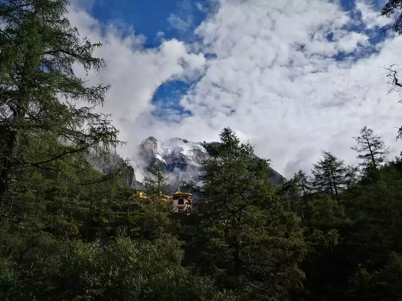 Today we have to climb several high-altitude mountains. Not long after leaving Xindu Bridge, we passed through Yajiang County, which is rich in matsutake mushrooms and is the hometown of matsutake mushrooms, with an altitude of only more than 2,000 meters. Subsequently, we will climb over the first Scissor Bay Mountain. Scissors Bay Mountain, its Tibetan name is "Jamanaza", which means Yangzi Pass. The pass is 4,659 meters above sea level and is one of the highest passes in the Khamba area via National Highway 318. There is the famous "Eighteen Bends of the Heavenly Road", each turn is a 180-degree turn, which is a test of the body and driving, we come to the observation deck, look down, the road is like a spirit snake coiled on the mountain, and the vehicles coming and going seem to be smart. Continue to move forward and cross the Nimagong Sacred Mountain, which is 4668 meters above sea level. The scenery of the mountains in western Sichuan is indeed beautiful, making people linger in it. Further forward began to cross the Kazila Mountains. Kazila Mountain is a mountain located on the border between Litang County and Yajiang County in Sichuan Province. The altitude is 4718 meters. Due to the higher altitude, the trees are even sparse, mainly alpine meadows. Looking at the mountains here, the mountains are stacked, one layer is farther than the other, and the color is lighter than the other, until the edge of the sky, it is really like walking on the "heavenly road". As they crossed the Kazila Mountains, the fog began to dissipate, and the clouds in the air began to increase, one was white and flawless, and the other was dark and psychedelic, changing rapidly. However, only in her arms can you feel this beautiful scenery. Mount Kazila is a mountain, but it doesn't feel like it's a mountain, as if it's a beautiful pasture, which makes people feel refreshed. On the way up the mountain, I met a large group of yaks, a piece of black, and there were scattered yaks in the distance, like black gold scattered on the green lawn, beautiful! The children all screamed. Standing at the Shanyakou Observation Deck, the mountains stretch in the distance, and different levels of green show the characteristics of western Sichuan. At noon, we came to the city in the sky - Litang, Litang County is 4,014 meters above sea level, which is the highest county in the world. From here, the road began to diverge, one went to Mangkang to Tibet, and the other was to Daocheng Aden. There is the famous Litang Temple, also known as Changchun Keer Temple, but due to time constraints, I couldn't go, so let's save it for next time. We had lunch here, and before we were in time, we went to the East Gate of Litang, which is also the main road to Tibet. After taking photos here, we embarked on the road to Aden, Daocheng. Continuing forward, the scenery on both sides changed slightly, and it turned out that we came to Rabbit Mountain. Rabbit Mountain is located in Daocheng County, Sichuan Province, in the north of Haizishan Nature Reserve. From a distance, it looks like rabbit ears standing in the wind, and the mountain is very peculiar, growing on the peak where no grass grows, which is quite spectacular and magnificent. When the weather is good, you can drive along the highway, and from a distance, it looks like a little rabbit is frightened, watching you in a panic! Surrounded by steep ice erosion peaks and forest landforms, against the crystal clear Haizimen, the real is wonderful. Further on, it is close to Haizi Mountain, Haizi Mountain has an average altitude of 4,500 meters, and the highest peak is 5,020 meters above sea level, with a total of 1,145 large and small Haizi, like a thousand diamonds scattered by God, shining in the mountains like a thousand diamonds scattered by God, and its scale and density are the highest in China, so it is called Haizi Mountain. Haizi Mountain is also the largest ancient ice relic on the Qinghai-Tibet Plateau, and is known as the "Daocheng Ancient Ice Cap". Entering the pass of Haizi Mountain, large and small stones and Haizi complement each other, forming a different landscape. The wind is strong, the sky is blue, and the clouds are very transparent, which makes people admire the magic of nature. The further we go, the closer we get to our destination. On the way, we passed many pagodas and resplendent temples, including a temple on a cliff, which amazed us and was called Rewu Temple. The area is large and magnificent, and I really don't know how people repaired it at that time, and I can't help but admire people's wisdom and ability. Climbing over Haizi Mountain, the terrain was slightly flat, until about four o'clock in the afternoon, we arrived at Daocheng County, there were poplar forests planted on both sides of Daocheng County, as if soldiers were welcoming us, I think autumn must be beautiful and spectacular. Gradually, we came to Daocheng Shangri-La Town, which is very close to the scenic visitor center, but after the smooth road, there is another mountain road, and you can overlook the entire Shangri-La Town halfway up the mountain. Finally, we arrived at our accommodation, the Holy Lake Beauty Hotel. Where we lived, we looked up and saw a majestic mountain, and the next day we learned that the mountain was called Niulang Sacred Mountain. White clouds surround the top of the mountain, and the fairy aura is floating.