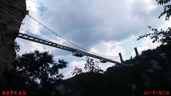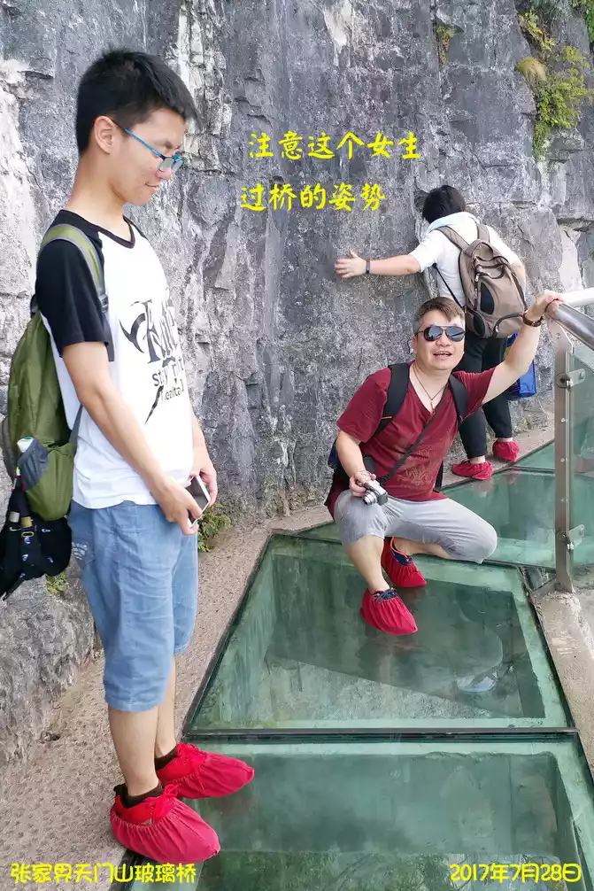 tourists who lean against the cliff wall and dare not walk on the glass. After crossing the glass plank road and walking on the Ghost Valley Plank Road, crossing the suspension bridge, Ghost Valley Cave, Qiu'er