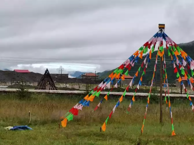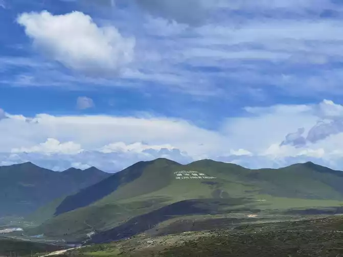 , everyone was in a much better spirit, maybe they had adapted to the plateau, so they began to carefully appreciate the surrounding environment, walked around the inn, and chatted with the boss for a while. This place is surrounded by mountains, and there is a monastery not far away, and on the meadow on the top of the mountain in the distance, there is a string of Tibetan Buddhist words, as if plants of different colors have been planted and then pruned. This is a characteristic of Tibetan areas, and in the next few days, we will see this way of writing on many mountaintops. The owner of the inn is also a monk, and he is the director of the nearby monastery. His house was converted into an inn. During festivals, gatherings of nearby villagers or monks in the temple are held here. So his kitchen is very large and there are a lot of tableware.