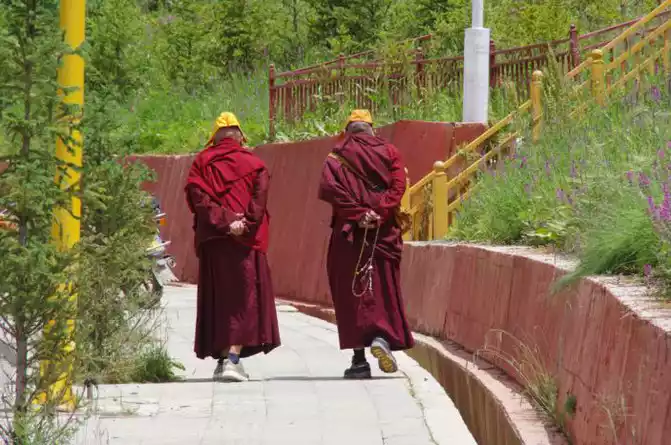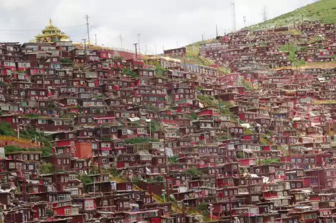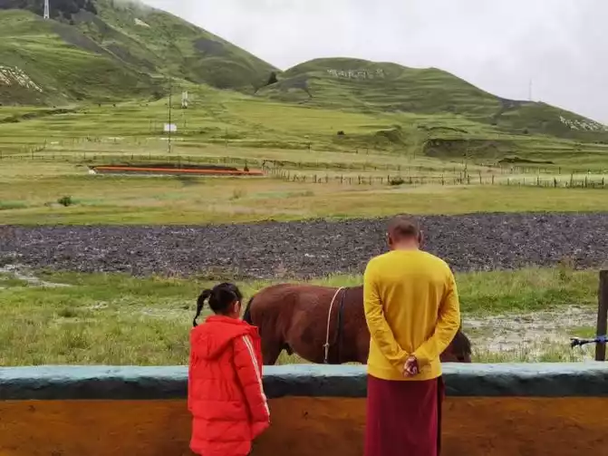 All you see on the side of the road are red wooden houses, where teachers and students live. There are men, women, and children who enter and exit the cabin, and they are all wearing monk's robes. Walk along the school road to a bus stop, which is the center of the campus, and there is a step walkway next to it to the top of the mountain. If we go up a bit, we can see the whole picture of the Buddhist Academy. But seeing the green mountains towering under the blue sky, from the foot of the mountain to the halfway up the mountain, densely built with countless red wooden houses, large or small, is very spectacular, this visual impact is really amazing. Looking down at the bus stop square, pedestrians shuttled back and forth, all teachers and students wearing saffron monk robes. This kind of scene is both fresh and mysterious, and there seems to be a great sense of distance between this picture, but it is obvious that you are in it, which is a wonderful feeling.Since the college was not yet fully open, we did not consult or conduct more exploration, nor did we go up the mountain to the heavenly burial platform. After staying for a while, we left Seda Buddha College and continued our return journey to Malkang County Accommodation.
