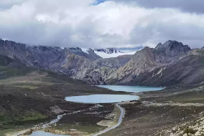 After breakfast, we left Xinduqiao and continued on our way. Along the way, mountains, rivers, flowers and plants, cattle and sheep are accompanied by them. The car snaked along National Highway 318, crossed the 4,700-meter Kazila Mountain, and reached Litang County (about 4,000 meters), the "high city of the world". After a simple lunch, walk on a mountain more than 4,000 meters high, accompanied by meadows and thin snow. Soon I came to an observation deck, looking at the blue sky and the mountains in the distance, a pair of lakes of similar sizes and shapes, like silver plates and jasper, this is the sister lake. And the snow-capped mountains further away, Ran Ran is the jade screen behind the sisters. After lingering for a while, we left the observation deck and went down the mountain to Batang County, the westernmost county seat in Sichuan on the southern line of Sichuan ---- Tibet.