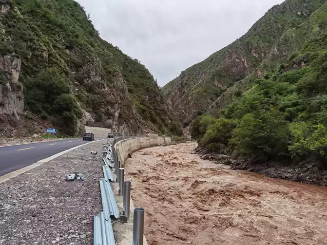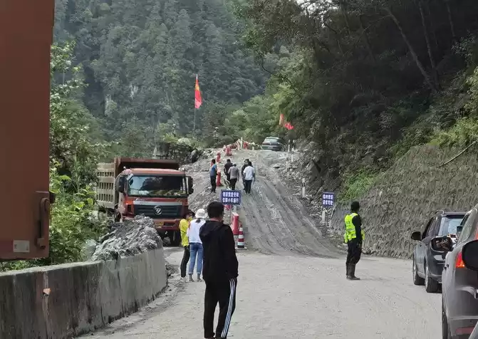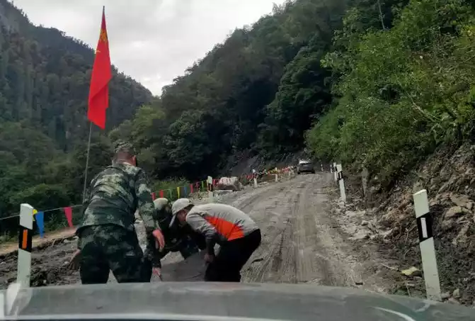, I wandered around the streets again, bought some specialties, and stayed at the hotel to wait for traffic news. At around 2 p.m., when they learned that the armed police force had built a side road next to the collapse site, the road was unblocked, and unilateral release was allowed, everyone cheered and immediately packed up and set off. Due to the large number of stranded vehicles, traffic jams are inevitable on the road. After passing through two places that have collapsed recently, it is really frightening to see the thrilling scene of road damage! Before and after the emergency repair of the road section, many armed police, traffic police, police, etc. commanded and guided the passing vehicles to quickly pass through dangerous places. The collapse is a cliff on one side and a torrent on the other, which is twenty or thirty meters deep, which is very thrilling. Emergency repair workers and large machinery are working intensely at risk. When we passed through the top of the hillside of the temporary side road, a large stone stood in front of our car, and several armed police signaled us to stop, and then they worked together to move the stone with their bare hands to let us pass. I couldn't help but open the car window, thank them repeatedly, and be in awe of them!
