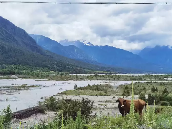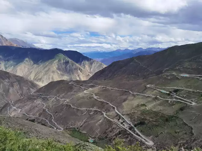 By consulting the information the night before, we decided to complete the originally planned 3-day journey from Batang to Nyingchi in 2 days, which is also conducive to avoiding overnight stays at high altitudes, so we set off very early today. Not far from going out, I encountered a road construction ban and waited for about 40 minutes to continue moving forward. After driving for about half an hour, we arrived at the Jinsha River Bridge. This is a bridge connecting Sichuan and Tibet, and when we cross the Jinsha River Bridge, we enter the Tibet Autonomous Region! Along the way, the road conditions are treacherous, often passing through narrow gaps between mountains and rivers, or on winding mountain roads. After hovering and climbing to the top of the mountain, you can easily drive on the alpine meadow for a while. The rivers that run along with the highway have a very fast water flow and a strong impact on the boulders or banks in the water, which is very spectacular. But the flow of rivers is uncertain, and the times are going forward and sometimes reversed. Later, when I checked the map, I found out that the rivers I saw today were: Jinsha River, Lancang River, and Nu River, and the three rivers flowed in inconsistent directions. During this period, we crossed Jueba Mountain, Dongda Mountain, etc., all at an altitude of about four to five thousand meters. At places above 4,000 meters, the air is thin, so you have to walk lightly and slowly when you get out of the car to see the scenery, and you have to calm down for a while when you get back to the car, so that you can continue to move forward after breathing smoothly. The car engine also seems to be powerless, but fortunately, our car is equipped with a 2.0T engine, which can provide surging power by increasing the speed of the turbo, and there is also a comfortable and safe suspension system, which carries us over the mountains and moves forward steadily! Accompanied by this steepness and beautiful scenery, we passed through Mangkang, Bangda and other areas, drove through the famous 72 turns, and arrived at Basu County in the evening to rest.