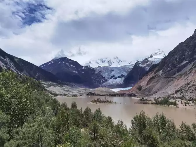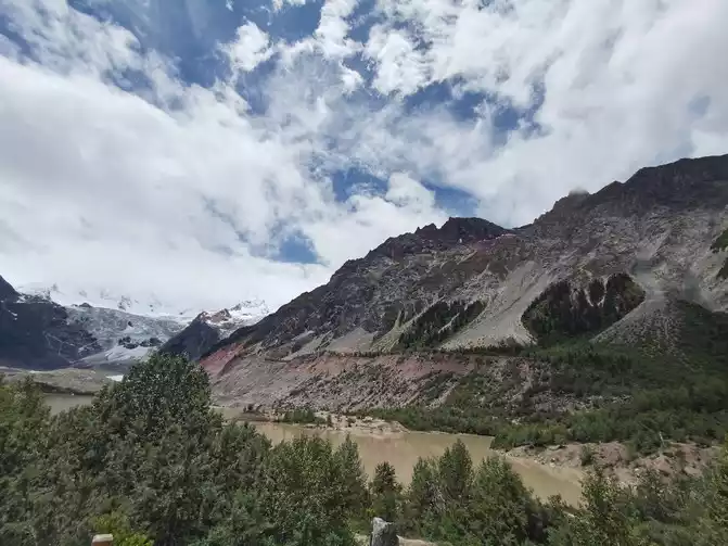 As soon as we checked into the hotel last night, we received the news that the road from Tongmai to Nyingchi section of National Highway 318 had collapsed and was closed again, and we were a little devastated at that time! This morning in the restaurant, I met many strange fellow travelers discussing the matter. After comparing the estimated road closure time with the additional time it would take to detour other roads, we decided to continue as planned. Among the major mobile navigation software, Baidu Navigation actually showed that the road ahead was smooth, which enhanced our confidence to move forward (but it turned out that some navigation updates were unreliable), so we ran all the way with a glimmer of hope. But when we arrived at the Midui Glacier, all the news confirmed the exact news that the "road ahead is not good", so we entered the Midui Glacier Scenic Area to visit. Take a sightseeing bus from the tourist service office into the center of the attraction and walk about 2 kilometers to the glacier's observation deck, where you can see the whole glacier and its structure: ice buckets, ice tongues, streams formed by melting ice, lakes formed by ice and snow meltwater, and spruce forests high on the mountain that support the glacier. Hiking on a mountain of nearly 4,000 meters, and constantly climbing up the steps, everyone was out of breath and very tired. But everyone did not feel seriously unwell during the process, indicating that we have basically adapted to the plateau.