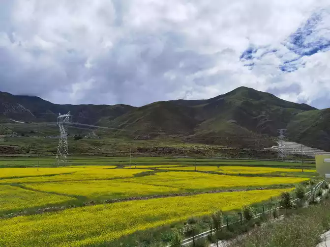 Early in the morning, it was dark and drizzling. We estimated that the visibility of the Brahmaputra Grand Canyon was poor, so we had to give up on our plans to visit this attraction. So it departed from Nyingchi and went straight to Lhasa via the Linla Expressway. Half an hour after departure, the sky cleared and the surroundings suddenly became colorful. Under the blue sky and white clouds, sometimes you can see hillsides covered with green trees, green trees turning into brown boulders in the blink of an eye, or a large field of golden rapeseed flowers under the red clay mountain, suddenly turning into a continuous meadow ....... It can be described as a continuous and dizzying scenery!