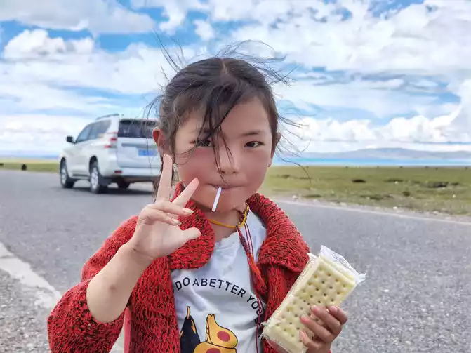 , I got up, packed my luggage, walked up to the nearby pedestrian bridge to look at the Potala Palace in the morning light, and then reluctantly left Lhasa. It took about 4 hours to drive north on National Highway 109 to Dangxiong County and turn into the Namtso Scenic Area. I bought tickets at the visitor center, had a simple lunch, and then headed to the center of the scenic spot. During the journey, we came to an observation deck, we were enjoying the scenery, and a little girl jumped out of the herdsman's hut next to herdsmen, with a cheerful smile on her red face, and her eyes blinked, as if she could talk, very cute. We pressed the shutter while stuffing her snacks. This little episode added a cheerful atmosphere and memory to our itinerary!