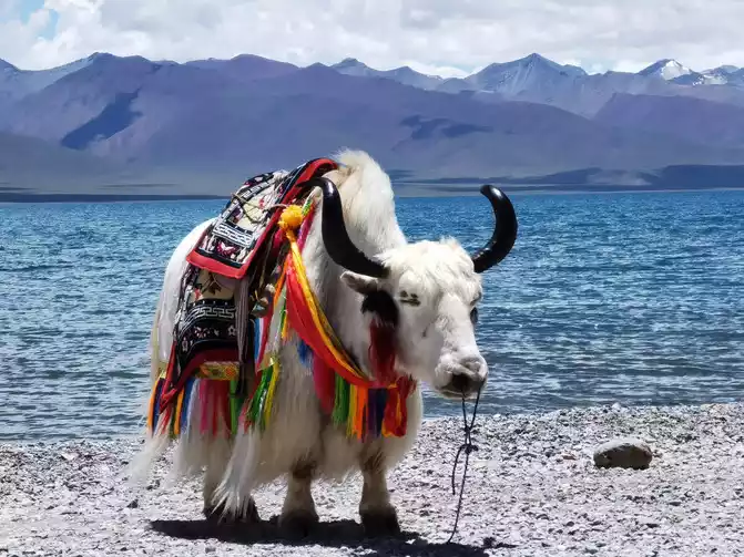 It is particularly transparent under the sunlight, and it is very beautiful against the snow-capped mountains and blue sky and white clouds in the distance. Some Tibetans pulled white yaks to the lake and let tourists ride cows to take pictures. They sang Tibetan songs loudly, adding a lot of vitality to the beautiful scenery.