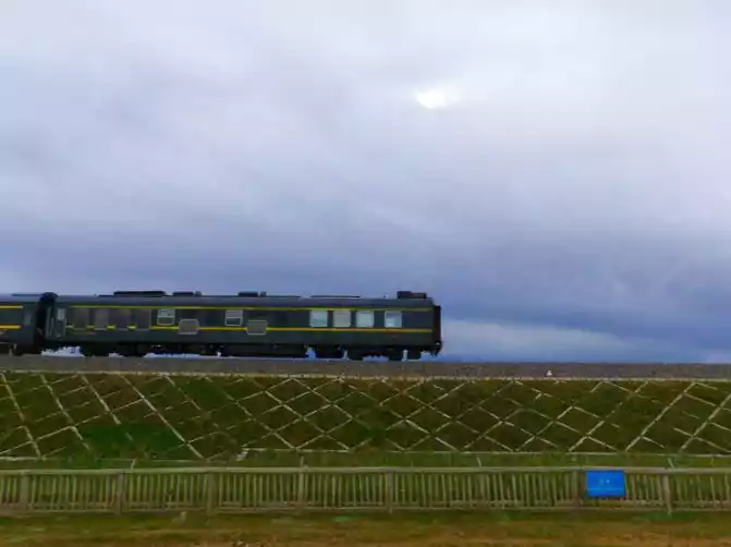 We planned to take the Sichuan-Tibet North Line back to Sichuan, so we left Dangxiong County and continued northbound along National Highway 109, which basically traveled more than 4 kilometers. Sometimes I encounter a Mercedes-Benz train on the Qinghai-Tibet Railway, as if I have entered a scene from an old movie, and everyone is in an uproar. After more than 3 hours of travel, we arrived at Naqu City at an altitude of 4,650 meters and checked into the hotel. It was the first time I stayed at such a high place, and the oxygen supply in the room was not very good. So I had some headaches and difficulty breathing at night.