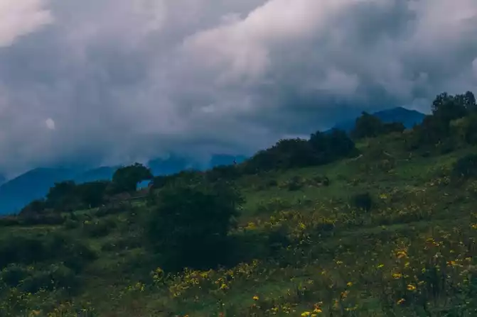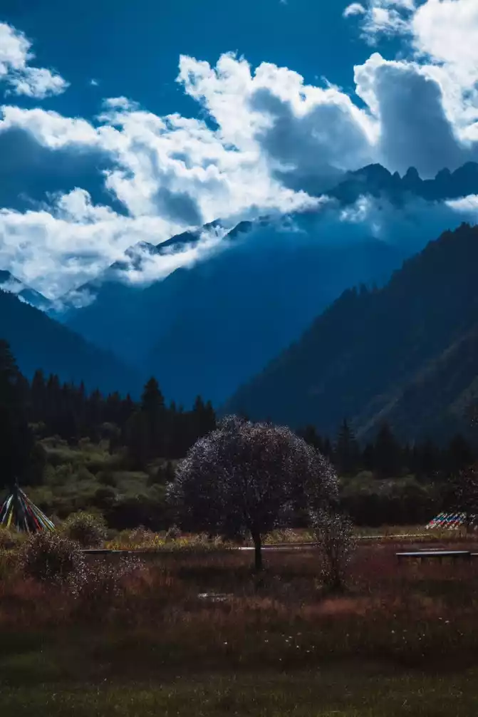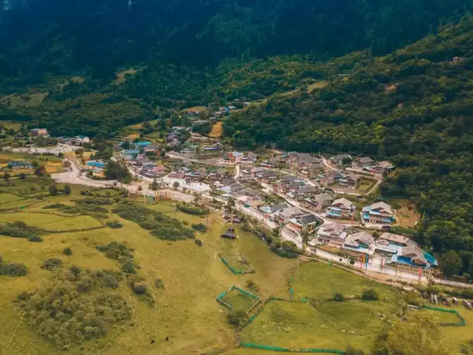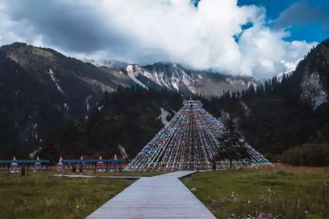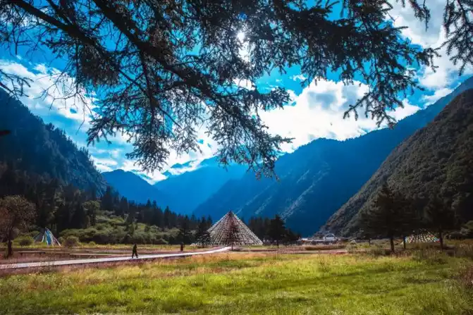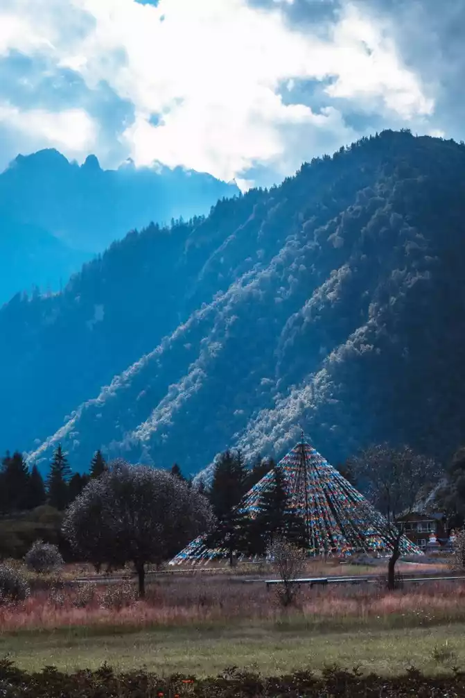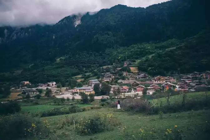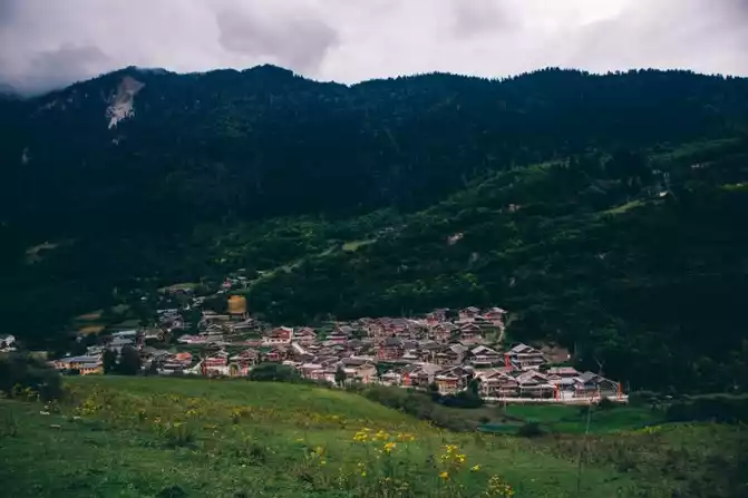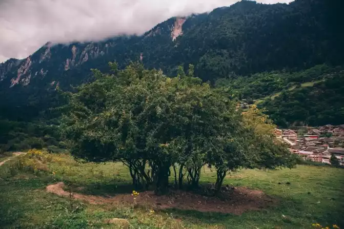 The hotel provided me with a pick-up and drop-off service in Zhongchagou, the hotel's car stopped in front of the hillside, I walked up the mountain, and on the way I met small flowers, clumps of sea buckthorn, trees of wild fruits, and the smell of cow dung floated in the air from time to time. I stopped at a flat place on the hillside to look at the valley. There are several Tibetan villages in this ditch, and looking over from the hillside, they are embedded in the dense forest, and the majestic mountains hold them in their arms.The altitude here is not enough for the mountains to cover with snow all year round, so there is a comfortable summer. The people here live a semi-agricultural and semi-pastoral life with great wisdom, and the wooden fence circles out the green space, cleverly separating cattle and sheep from crops.
