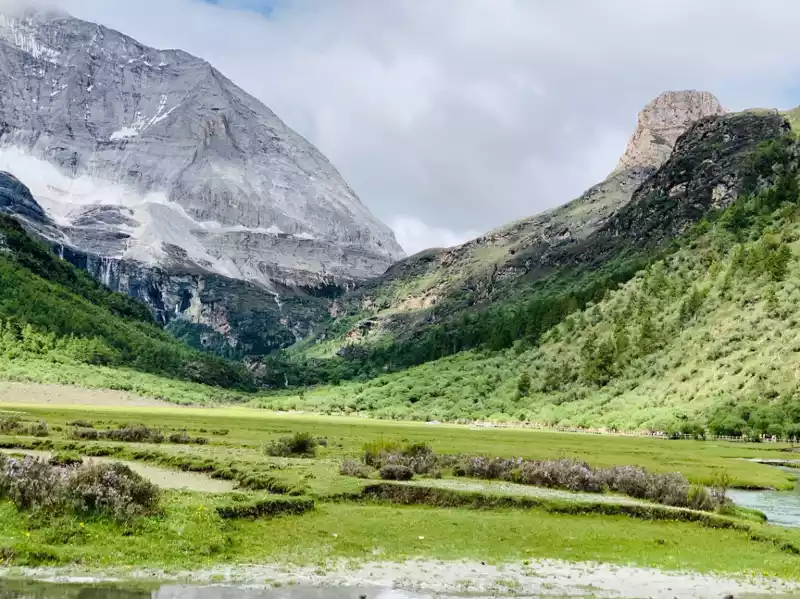 The second stop is the Luorong Cattle Farm (also the end of horseback riding), where nearby villagers graze. Luorong Cattle Farm is backed by three sacred mountains and is a good place to see the snow-capped mountains. The cattle farm is surrounded by continuous alpine meadows, and in spring and summer, wildflowers bloom on the meadows, which is very spectacular. This is the starting point to the five-color sea and the milk sea, the road during this period is not easy to walk, the local people call this last 1.8Km a desperate slope, the whole slope is nearly 180 degrees, and it is purely by the use of hands and feet to "climb" to reach the top of the mountain (considering that I fell my leg last year, plus the scenic spot with limited physical fitness is close to the point when it is closed, I gave up the last 1.5Km climb).