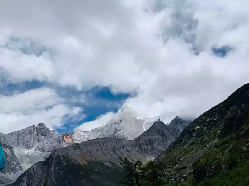In the morning, we set off from Chengdu and it was raining heavily. I kept checking the weather forecast along the way, but the weather difference between the mountainous areas and the urban areas of Sichuan is very large, and the tour leader told us not to worry, the weather in the mountains should not rain. Sure enough, when we arrived at Moshi Park halfway through, there was no rain, the mountains were cloudy, and the team leader predicted that it would be cloudy in the mountains. When you arrive at the gate of the scenic spot, there is still a faint sun, which is really worthy of being the western Sichuan of "enjoying Gesang in spring to escape the heat in summer, watching colorful forests in autumn and stepping on snow in winter". The ticket staff of the scenic spot suggested that they go and return quickly, and their prediction was that there would be rain later.