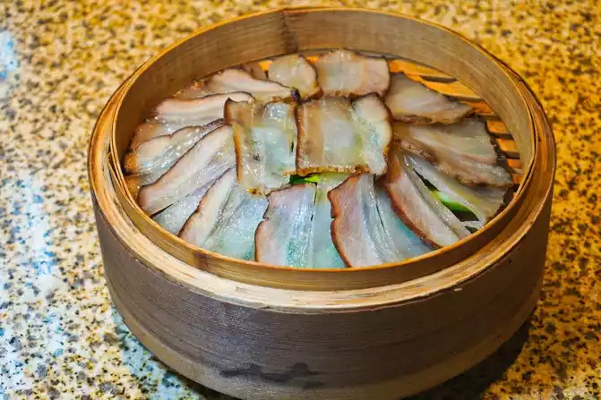 【Ancient Village Three-Year Old Bacon】The local Tibetan bacon, after simple cooking and steaming, under the chef's superb knife skills, pieces of crystal clear old bacon look beautiful and edible, and smell even more fragrant.