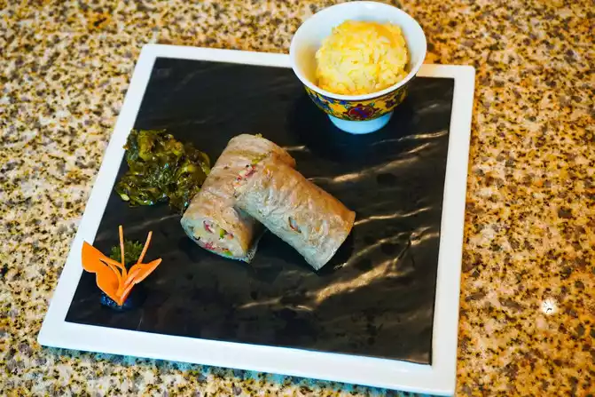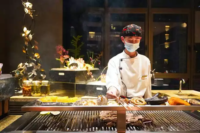 Send your love to the beautiful scenery of the mountains and rivers, indulge in delicious food. Choose [Mai] Chinese Restaurant, in addition to tasting the award-winning highland barley pan-fried baked yak steak, in fact, Tibetan and Qiang-style roasted lamb shank, air-dried hand-torn yak beef, hibiscus handmade peony shrimp, leek shell live abalone, matsutake bamboo shoot Tibetan chicken soup, green matsutake Tibetan pig, panda egg yolk bun, Manjiang red Shangpin silver cod, special stir-fried morels, soup loofah tips, gold-wrapped silver handmade cakes, Tibetan shells and white fungus stewed pears...... It's all worth a try.
