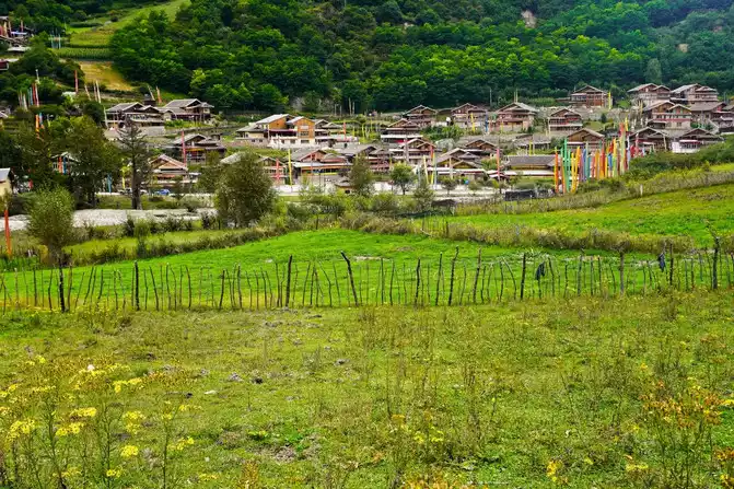 This is the quiet and beautiful Zhongchagou, adjacent to the Jiuzhai Luneng Hilton Resort. Zhongchagou maintains the most primitive Tibetan style, with wooden houses, one after another, surrounded by colorful prayer flags, waving in the wind, which is wonderful. With the dim lights of Jiuzhai. Luneng is in stark contrast.