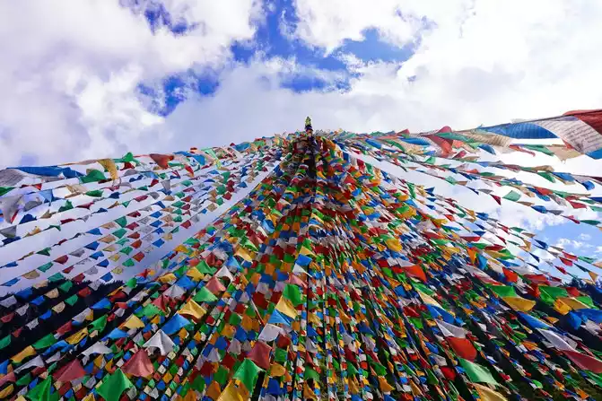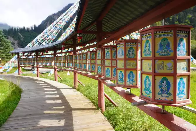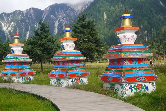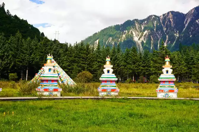 Walking into Ganhaizi, you will be attracted by the beautiful scenery of this beautiful valley and more than 100 miles of grasslands and wetlands. Under the blue sky, prayer flags flutter in the wind, and arc-shaped pagodas are lined up one after another, in an orderly manner, with a unique collector's style, which is wonderful.