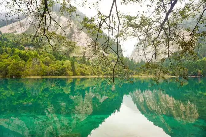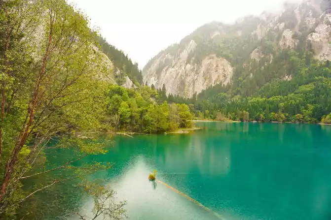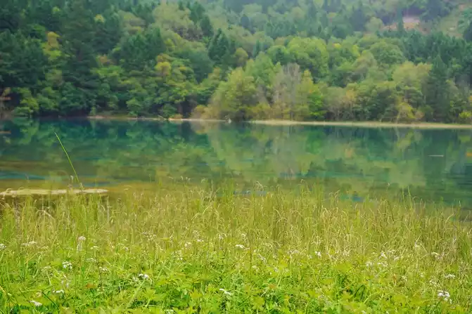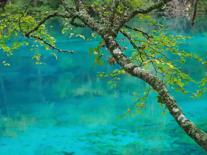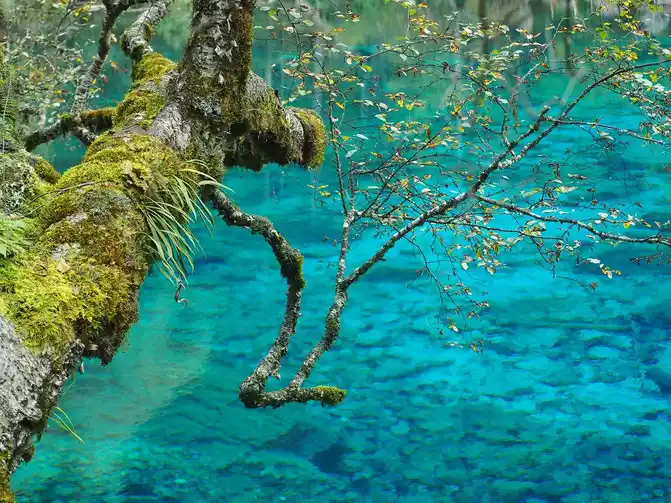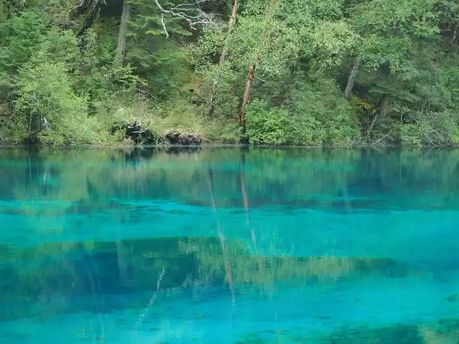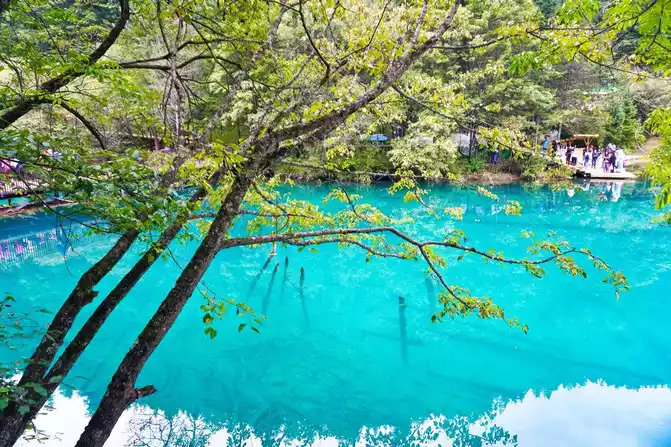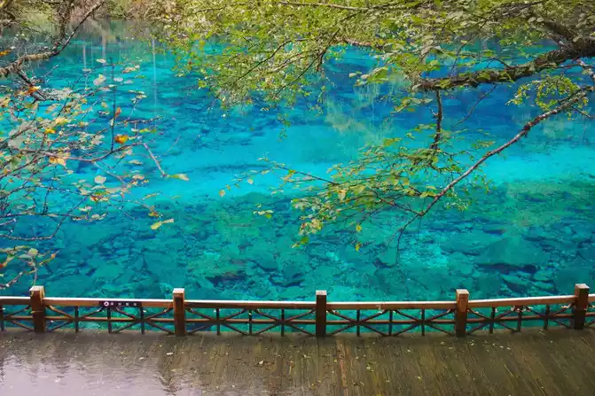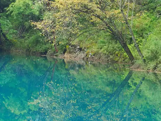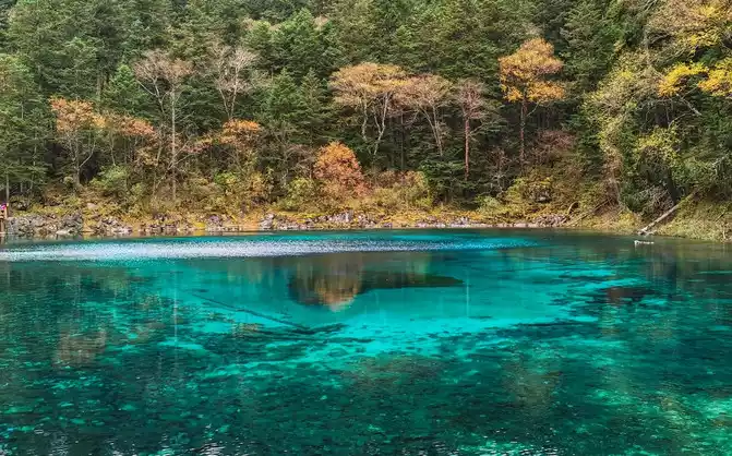 The world praises: The most essential place of Jiuzhaigou is the sea of five flowers, which has the reputation of "Jiuzhaigou is a must". Through the forest plank road, all the way downhill, you will reach the sea of five flowers in an instant. Overlooking the sea of flowers, it is like a treasure inlaid with fragments of colorful gemstones, dazzling. Looking at the Sea of Five Flowers up close, underwater coral-like ferns and algae plants are rampant, and there are dead trees stranded, and fish jump in it, and withering and vitality coexist, forming a different and colorful landscape picture. The crystal clear lake reflects the peaks like ink paintings, and the dense forests on both sides of the plank road are quietly impregnated with the colors of golden autumn as time goes by. There are both the gorgeous underwater world and the colorful water world, and the romantic sea of flowers is the beautiful place in the fairy tale Jiuzhai.