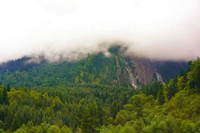 In the early morning of the rain, the green mountains shrouded in mist, the stream gurgling next to the asphalt road, after a 15-minute drive to Jiuzhaigou, after transferring to the scenic bus, the trip to Jiuzhaigou officially began. The fresh air penetrated through the windows and into the carriage, mixed with the fragrance of wildflowers, and the carriage was filled with fragrance in an instant.