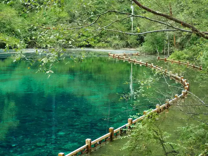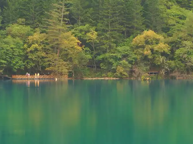 Walk down the plank road down the mountain for 1 kilometer, and you will reach the smallest and most beautiful colorful pond in Jiuzhaigou. The colorful pond is famous for its purity, clarity, beauty and color. Whether it is spring, summer, autumn or winter, or cloudy, rainy and snowy, the water in the colorful pond is rippling all year round and as clean as new. Coinciding with the rainy season in August, the lakeside stack in front of us is overflowing with blue water, and the yellowed trees on both sides of the river hang low, like harps standing in the mountains, waiting for a grand performance. In the slightly rippling boardwalk, fallen leaves are falling, like the vertical notes that are scrambled, floating in the colorful pool. The mountain wind blows the Buddha, the brown stone hits the stone, and splashes circles of layered golden ripples, which is beautiful. The small and exquisite colorful pond, due to the legging of aquatic plants and ferns at the bottom of the water, the original blue lake has evolved into a colorful color, almost comparable to the sea of flowers, which is particularly delicate.