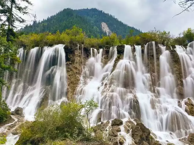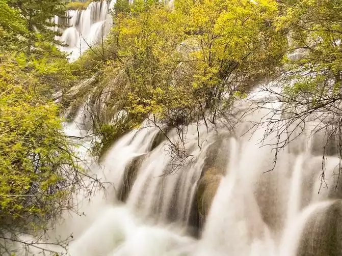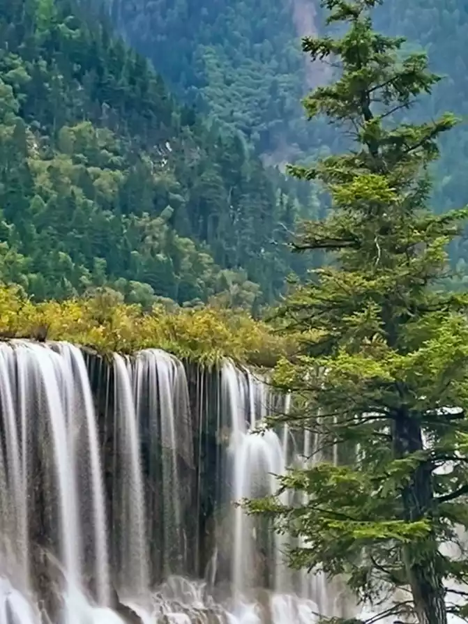 The mythical Jiuzhai is famous for its quiet, agile and beautiful water. There is the widest Nuozhilang Waterfall in China. With a width of 270 meters and a height of 24.5 meters, the waterfall is one of the largest calcified waterfalls in China. Standing on the observation deck, overlooking the Nuorilang Waterfall up close, the waterfall water that swallows the mountains and rivers, falling vertically, the sound is vast, like thunder. The water of the waterfall suddenly flows like the Milky Way, and the waves are magnificent; Suddenly, it resembled thousands of silver beads, crystal clear. The scenery is myriad and intoxicating. Just like its name "Nuori", its meaning in Tibetan is like a strong male god, showing his "fit" body in the quiet mountains, or proud, or tender, just to win the smile of the fairy of heaven.