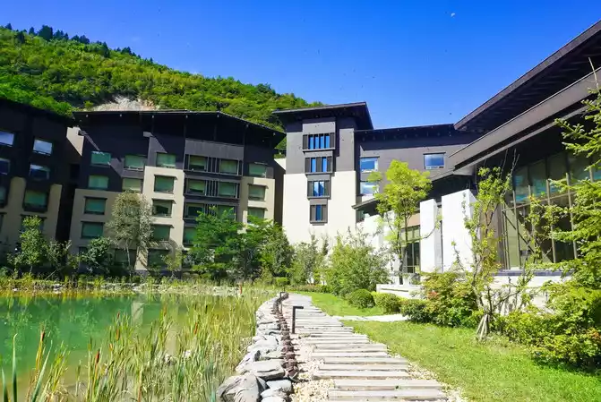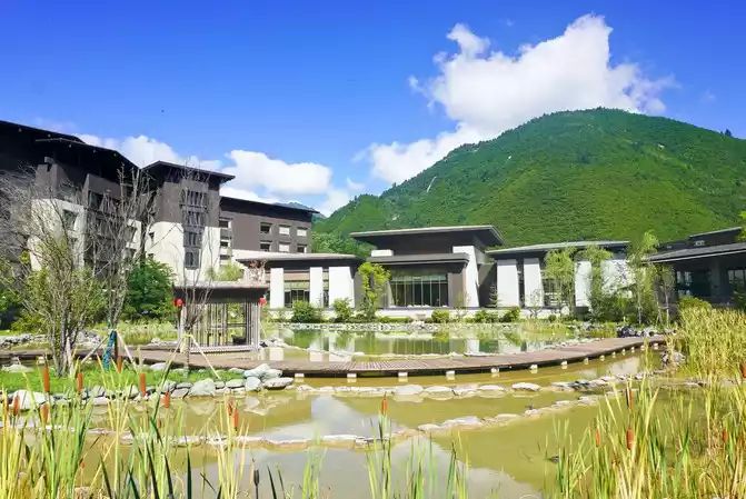 green mountains are quiet, and blue water is gurgling. Stay in a beautiful place in the mountains. Pushing open the window is a landscape picture of the sunny area, and comfortable hotel service makes the journey more enjoyable. Life should be enjoyed, and time should be wasted.