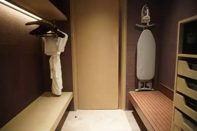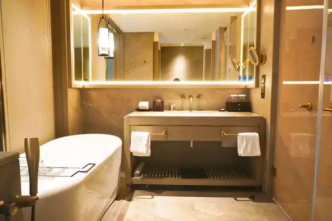 Walking into the bathroom of the dry and wet partition, the small drawer is equipped with free disposable toiletries, as well as sewing kits, razors, and makeup remover utensils. The most surprising thing is that in the upper right corner of the sink, there is a switch that can play music. If you are tired from playing in the mountains and waters outside, you might as well lie down in the bathtub, take a bath, and listen to music. Reading a book is full of comfort and as comfortable as at home.