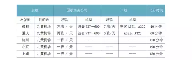 1. Aircraft: Jiuhuang Airport has opened direct flights to Beijing, Shanghai, Xi'an, Chengdu, Chongqing, Mianyang and other cities, as well as Guangzhou and Shenzhen stops at Chengdu (Chongqing) and Jiuzhai routes.