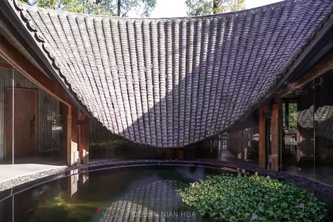 Entering the lobby, the whole building makes extensive use of logs, bamboo art and floor-to-ceiling glass windows... Even indoors, the beautiful scenery outside the house is unobstructed, and the circular hollow in the middle makes a Chinese landscape.