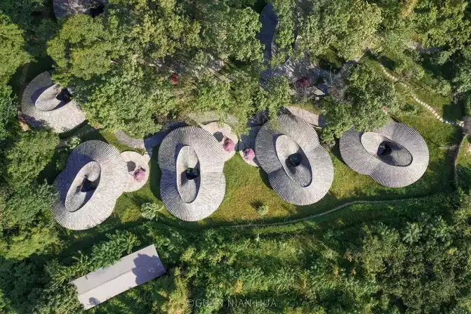 Soon we arrived at the most anticipated Daoming Bamboo Village on this trip, the blue tile roof is ring-shaped, this idea comes from the infinity symbol ∞ of the Taiji Diagram, representing integration and infinity. At that time, I came here for aerial photography, and I found that this place is actually very suitable for a weekend vacation.