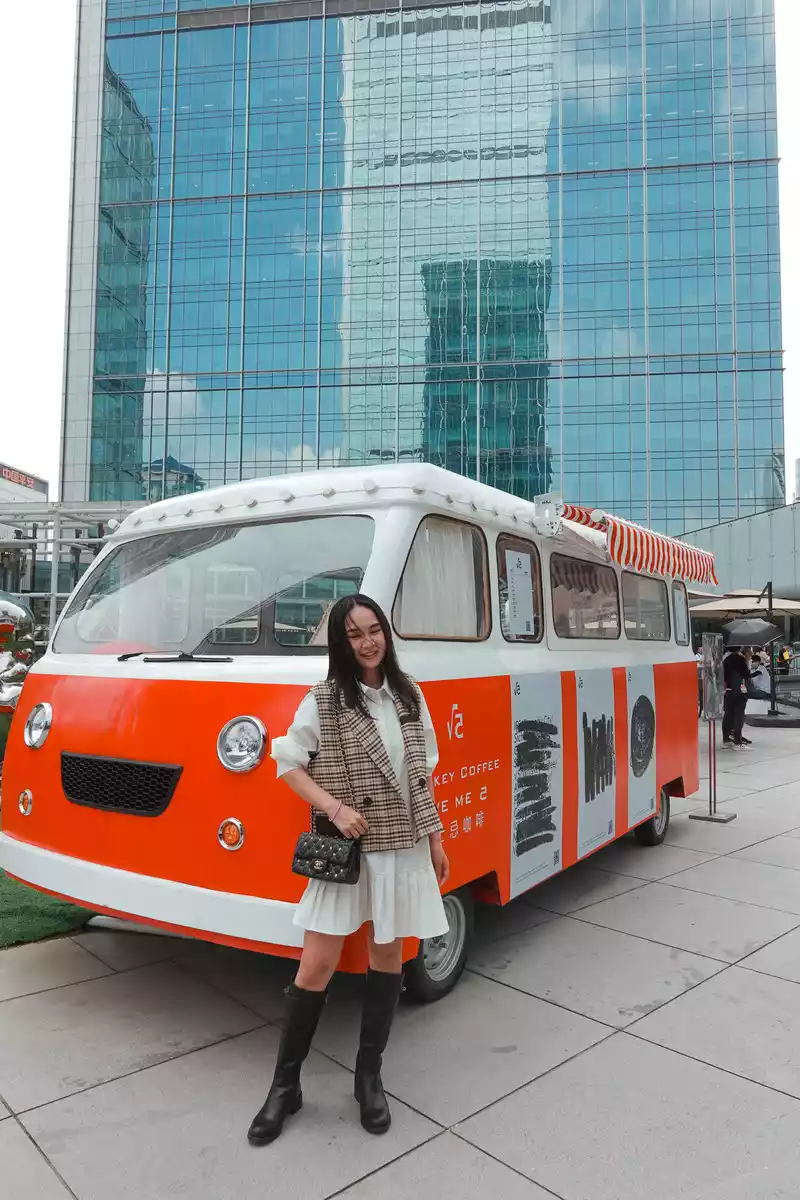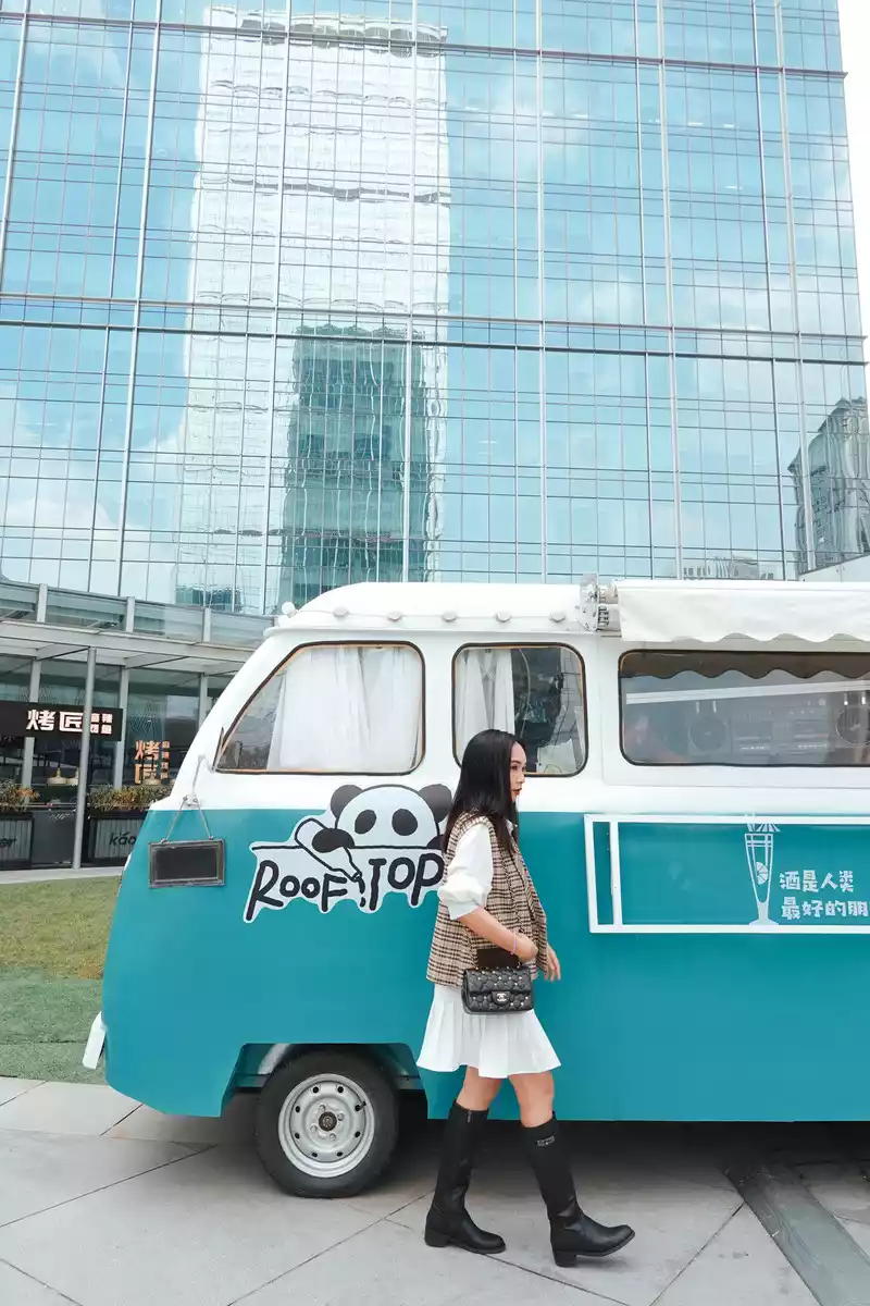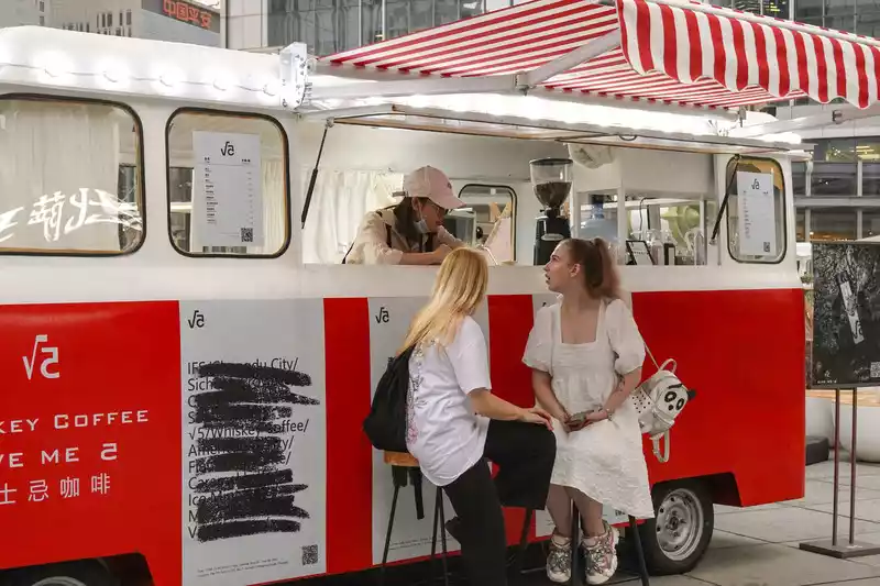 cute food truck opened its doors, and there were two foreign ladies visiting it, as if it was in a foreign country.