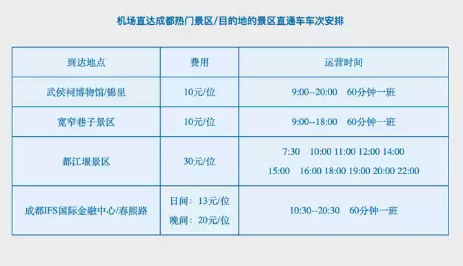 The most convenient way is to take the "Chengdu Scenic Area Through Train", which can be directly from the airport, 13 yuan one-way during the day (08:30~18:00) and 20 yuan one-way at night (18:15~23:00), and the boarding location is at the T1 International Arrival Exit and T2 Terminal 4/5.