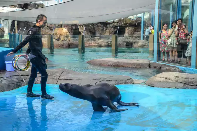 There is also a sea lion performance area next to the viewing area, I believe many people can't tell the difference between sea lions and seals, at this time you need to popularize science for everyone, so as not to be embarrassed for children to ask, first of all, the ones who participate in the performance will sell cute sea lions, because they have a better temper, as long as they feed the fish, they can sell their skills without selling their bodies; secondly, sea lions have long necks, can raise their heads and push the ball, giving people the illusion of standing up, while seals can only lie on the ground and roll; In addition, there is a distinctive feature on the head, sea lions have complete auricles, while seals have only one ear piercing.