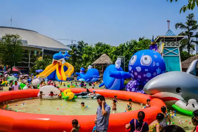 After visiting the polar animal area, there is also a surf pool near the cetacean show, which is a paradise for children to play in the water, with free floating toys for children to choose from