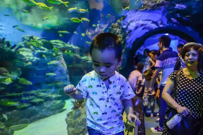 Continuing inside, there is an undersea tunnel full of people, and the strange scene attracts people to stop, and it is slightly difficult to even move forward, schools of colorful fish are bustling, and from time to time there are large sharks and manta rays paddling by, causing people to exclaim