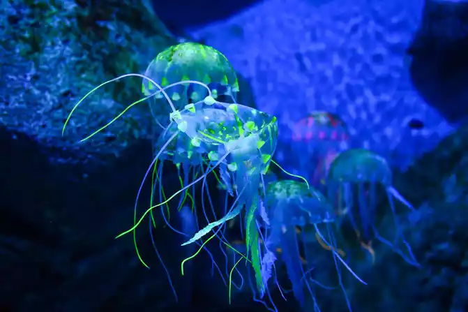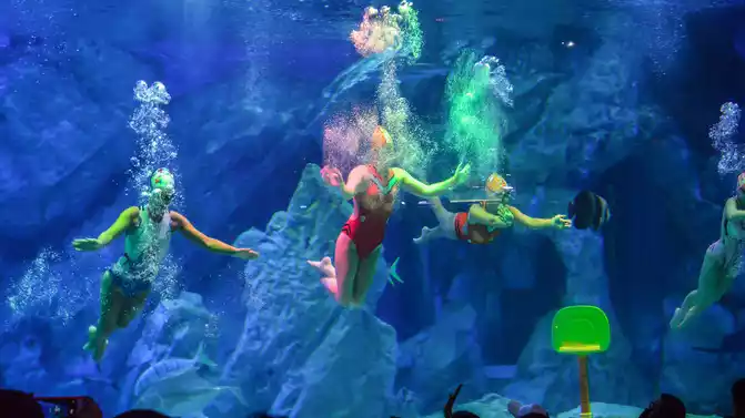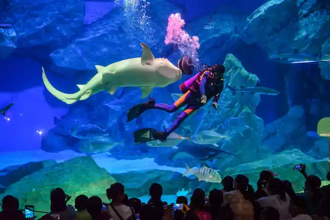 After passing through the undersea tunnel, you will arrive at the core shark performance area, the most exciting is the undersea ballet, where people and sharks dance together