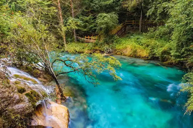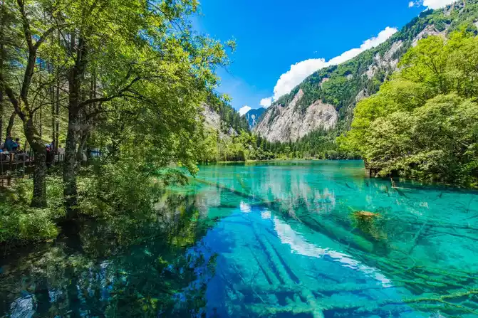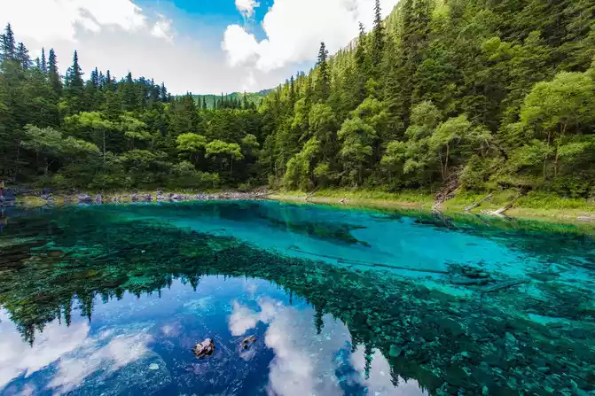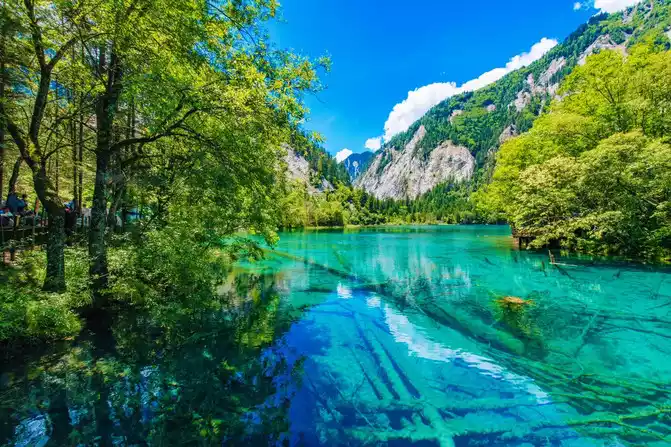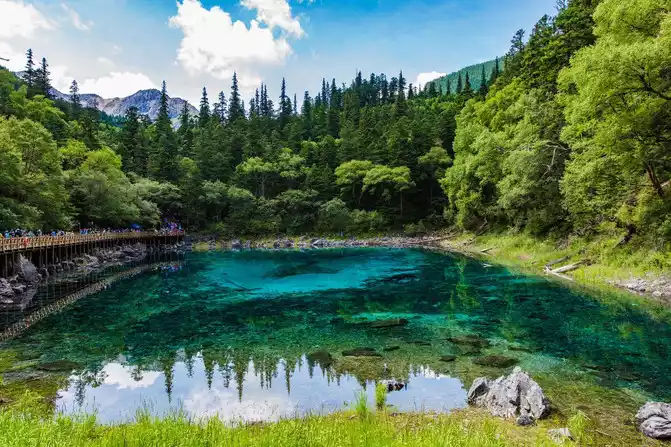 Further down is the colorful pool known as the Eye of Jiuzhai, which is 2,995 meters above sea level and 6.6 meters deep, hidden in the dense forest like a huge sapphire, and is the smallest and most gorgeous pool in Jiuzhaigou. Due to heavy rain flooding the walking trail some time ago, it can only be seen from top to bottom.