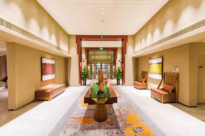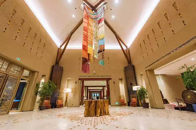 From the moment you step into the lobby, you can feel the design style that perfectly blends modern and Tibetan style, the thousand-year-old linden wood placed in the center is very eye-catching, and the auspicious cloud prayer flag hanging on the top is a way to pray for blessings. The front desk thoughtfully checked in for us quickly and asked the staff to help carry the luggage to the room, and the whole process was very comfortable.