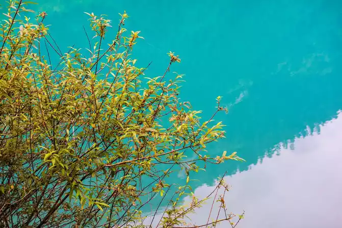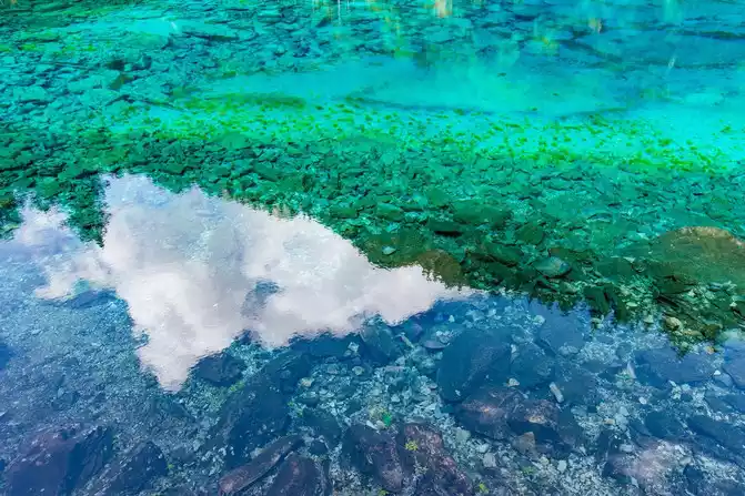 When the sunlight is reflected, various colors blend together, with white clouds, making the water color of a lake appear both true and illusory, like a dream and a magical color, as if entering a fairy tale.