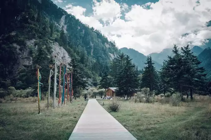 Follow the wooden plank road straight to the end. The undulating mountains in the distance, the grass full of mountain flowers, and the colorful prayer flags are all beautiful scenery.