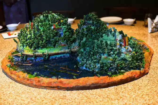 I heard that this decoration on the table was a Jiuzhaigou model that his team spent two weeks kneading, and he was very careful and dedicated.
