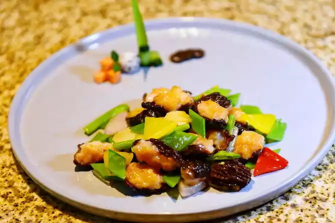 Stir-fried morels are a dish created by Master Liu Yang, selected from local morels, which have been uniquely processed, bright in color, smooth and refreshing.