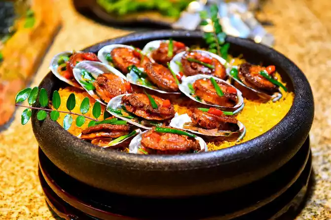 leek raw shell live abalone is a delicacy made from leeks, abalone and other ingredients, with bright color and full chewy texture.