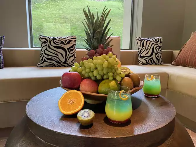 I have to praise the environment on this side of the villa is super beautiful, extremely private, and all kinds of details show excellent quality. The wide outdoor balcony offers a panoramic view of the lake and mountains in the distance. By the time we returned from our visit, the staff had already arranged everything for us in the living room.