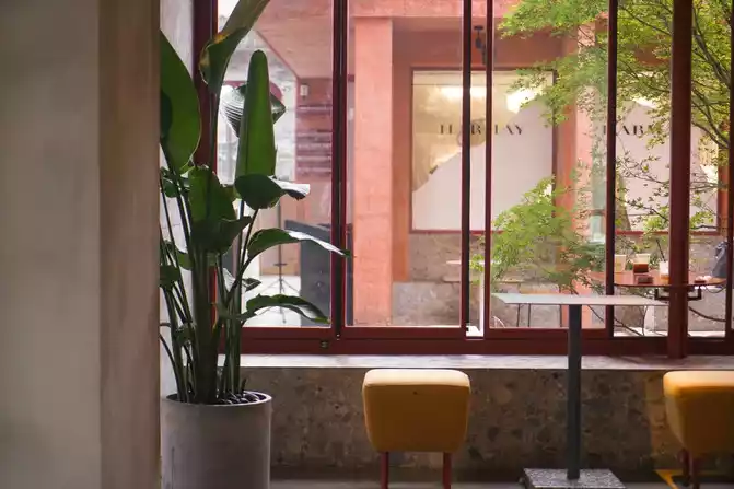 most eye-catching thing on the street is this Kaminarimon hot pot, which combines coffee, hot pot, bar, and gallery. The brick red geometric design is particularly suitable for taking pictures, I walked around the side, and I couldn't believe that this was a hot pot restaurant!?